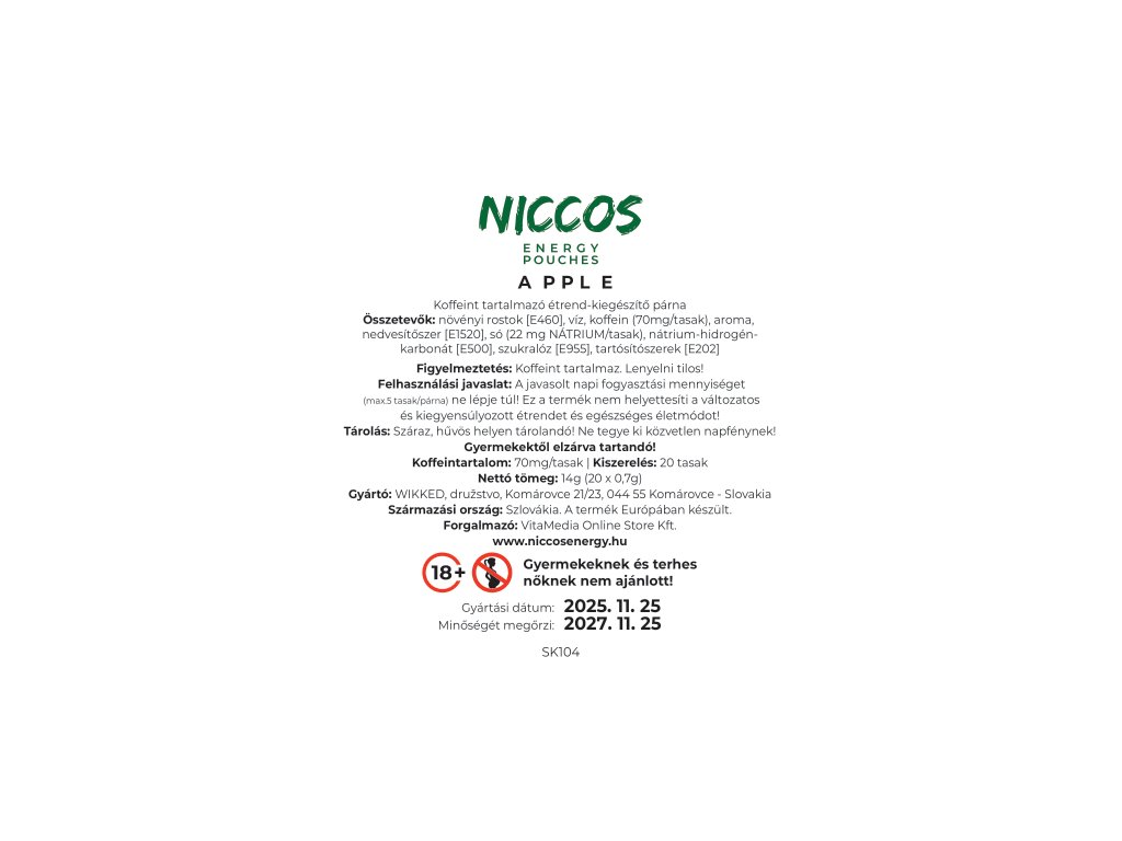 Növeld energiájádat a NICCOS Apple koffeines tasakkal! Minden tasak frissítő almaízt ad, miközben 75 mg koffeint tartalmaz, amely tökéletes azokra a pillanatokra, amikor gyorsan fel kell venni. Akár dolgozol, akár tanulsz, akár útközben, ezek a tasakok kényelmes és diszkrét módot kínálnak arra, hogy egész nap energikus maradj. Mivel minden 14 grammos dobozban 20 tasak található, bőven lesz szüksége a folytatásra. Egyszerűen tegyél egy tasakot a szádba, élvezd a ropogós almaízt, és érezd a lendületet. Mondj búcsút az energiaitaloknak és a kávénak – a NICCOS Apple koffeines tasakok az Ön új energiamegoldása!