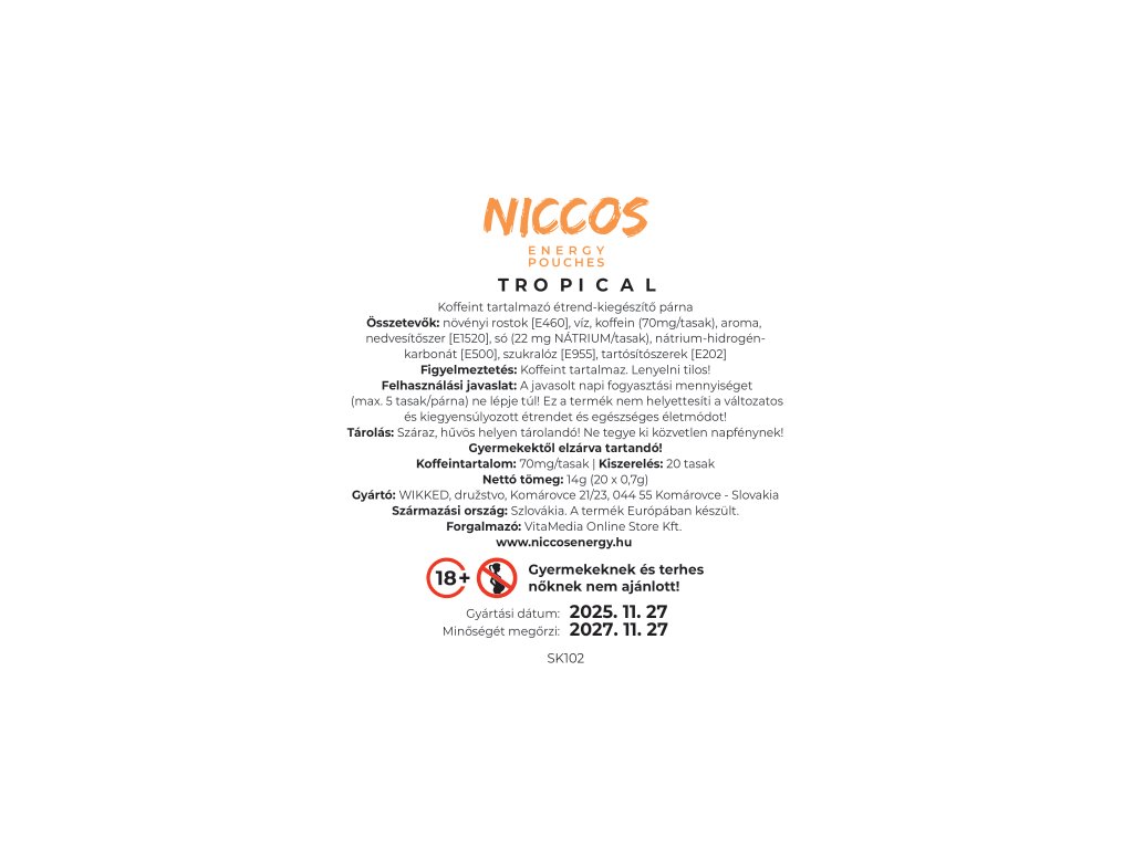 Növeld energiájádat a NICCOS Tropical koffeines tasakkal! Minden tasak frissítő trópusi ízt ad, miközben 70 mg koffeint tartalmaz, amely tökéletes azokra a pillanatokra, amikor gyorsan fel kell venni. Akár dolgozol, akár tanulsz, akár útközben, ezek a tasakok kényelmes és diszkrét módot kínálnak arra, hogy egész nap energikus maradj. Mivel minden 14 grammos dobozban 20 tasak található, bőven lesz szüksége a folytatásra. Egyszerűen tegyél egy tasakot a szádba, élvezd a ropogós trópusi ízt, és érezd a lendületet. Mondj búcsút az energiaitaloknak és a kávénak – a NICCOS Tropical koffeines tasakok az Ön új energiamegoldása!